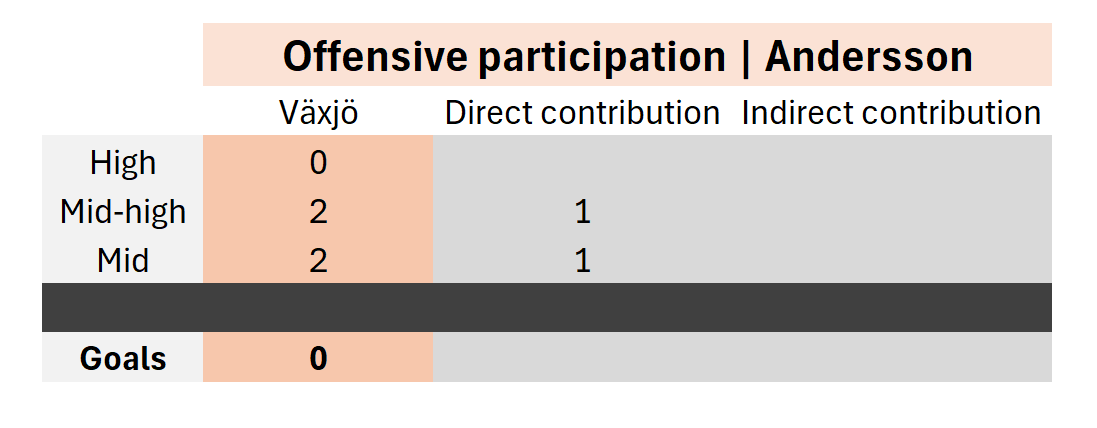 Andersson was contributing to his line in this game, being in on half of the scoring chances. Though like I mentioned before, I think the total numbers just must be higher for Växjö to be competitive. But his participation in what they actually do produce is fine, it is just not enough created chances from having a top offensive defender on the court.