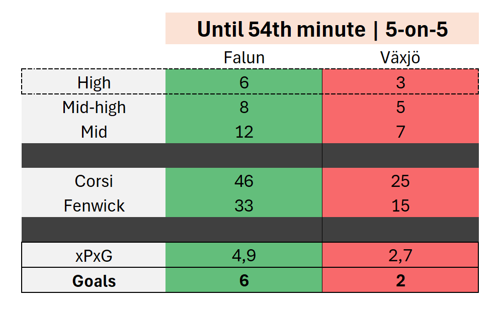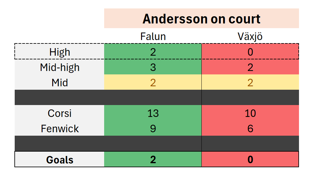 There was an advantage for Falun during the Andersson minutes of this game. The shot share statistics (Corsi and Fenwick) are for Falun, and so are the big scoring chances. I would certainly have expected a higher total of offensive scoring chances for Växjö, but it did not happen in this game. This for sure had an impact of them only scoring two goals for the first 59 minutes of the game.