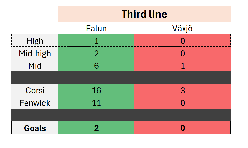 I had the third line of Växjö down for only three shot attempts and zero unblocked shot attempts during the entire game. This while being hammered with shot attempts against, and losing the scoring chance battle 8-1.