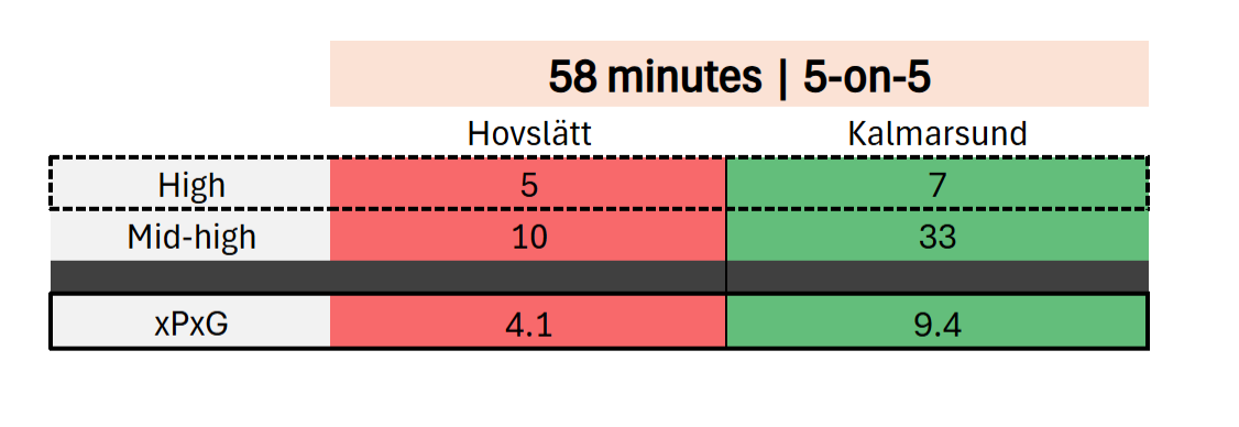 Kalmarsund are up 40-15 in big scoring chances in this game. That is a lot. The scoring chances off of high danger shots are actually pretty similar, but the ones coming from mid-high danger shots are extremely one-sided in favour of Kalmarsund.